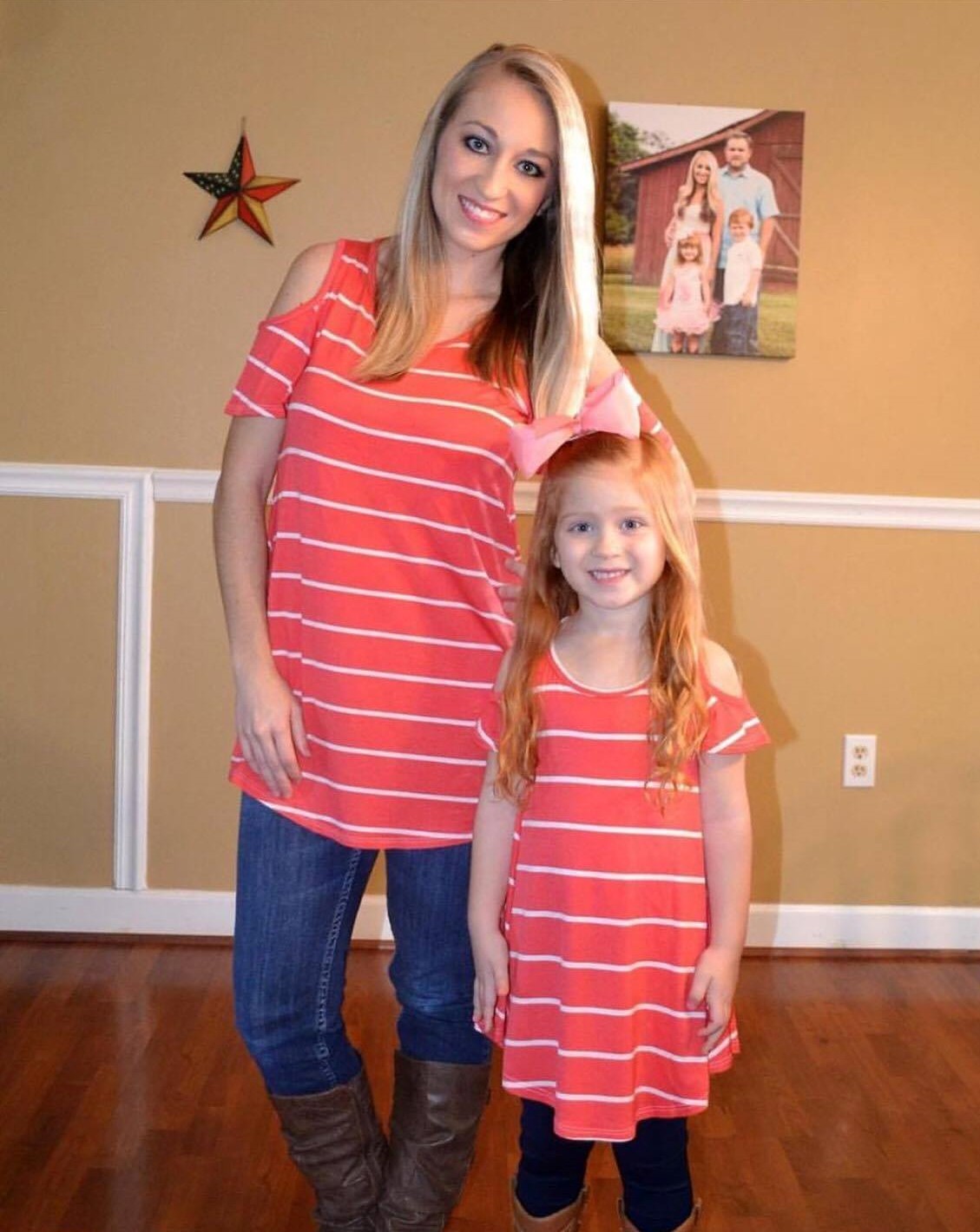 Mommy and Me! How sweet it is to match your daughter! this cold shoulder, coral striped swing tunic looks cute with leggings or tights!